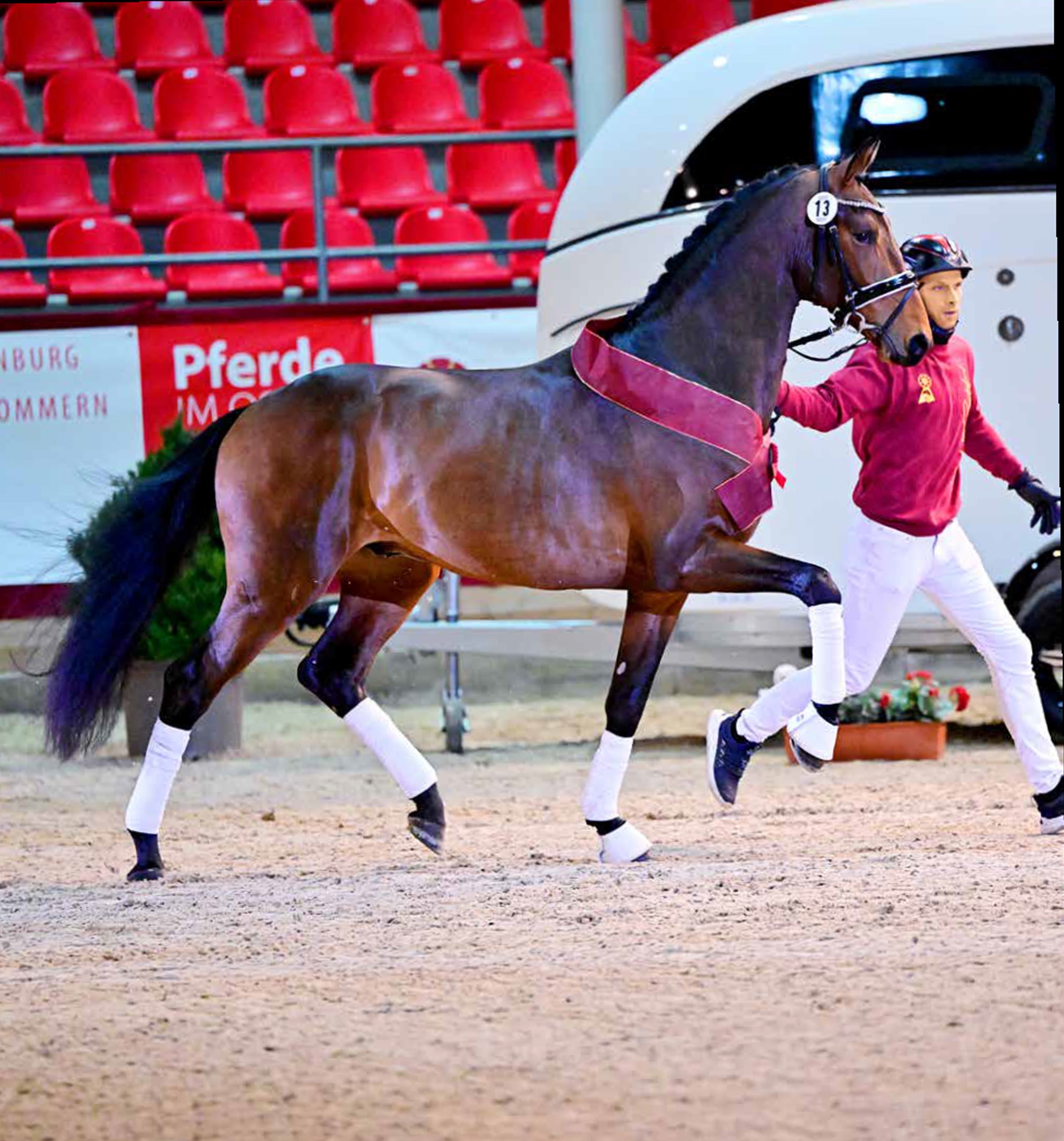 Vaters Fürstenball. Gleichzeitig vermag er sich kraftvoll mit großer Agilität und Schulterfreiheit zu bewegen, Attribute, die seinem großartigen Muttervater Jazz und dem dann folgenden niederländischen Background zuzuordnen sein dürften. Ob auf dem Pflaster, an der Longe oder im Freilaufen, beim Schaufenster der Besten meldete Franzmann bei jeder Gelegenheit seinen Anspruch auf die Siegerschärpe eindrucksvoll an.