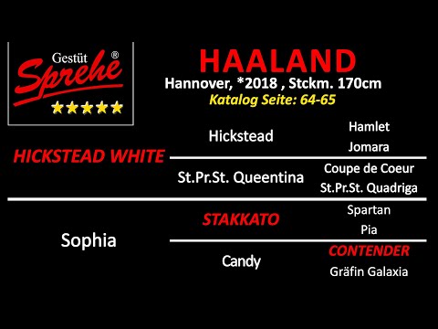 Harmonisch konstruierter Nachwuchshengst von hochsportlicher Eleganz. Der Bewegungsablauf ist unverkennbar durch den Vater Hickstead White geprägt: Mit viel Mechanik und einem stets kraftvoll aktiv fußenden Hinterbein sind im Besonderen der Trab und der Galopp von enormer Qualität. Haalands Sprungablauf vereint die Modernität des Hickstead White mit den Reflexen des Muttervaters Stakkato und der Kraft und dem Vermögen des in dritter Generation strahlenden Contender. Im 14-Tage-Test von Neustadt/Dosse stand mit einer springbetonten Endnote von 9,18 ein überragendes Ergebnis im Protokoll des Nachwuchsbeschälers. Haalands Turnierdebüt in 2022 hätte nicht glanzvoller verlaufen können. Mit Höchstnoten bis 8,8 stehen fünf Siege unter dem Sattel von Sebastian Elias zu Buche! Haaland wird nun unter dem Sattel der U25-Kaderreiterin Henrike Ostermann für den internationalen Turniersport vorbereitet.