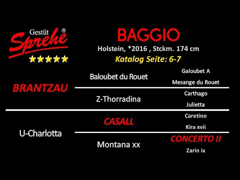 Muttervater Casall ist das Aushängeschild der Holsteiner Zucht. Mit seinem ständigen Reiter Rolf- Göran Bengtsson bestritt er diverse Championate und gewann unzählige Große Preise. Allein in Deutschland sind 315 Casall-Kinder S-erfolgreich, aktuell belegt Casall Platz sechs der weltbesten Springvererber (WBFSH). Nicht weniger wertvoll ist der in dritter Generation des Pedigrees firmierende Concerto II. Der Contender-Sohn schaffte es, in nur drei Jahren des Deckeinsatzes Spitzenpferde in Serie zu liefern. Baggios Mutter U-Charlotta ist Halbschwester zu vier international erfolgreichen Springpferden und lieferte bereits zwei in der internationalen Youngstertour erprobte Nachkommen. Sie entspringt dem Holsteiner Stamm 503, der auch den unvergessenen Livius für Peter Luther hervorgebracht hat.