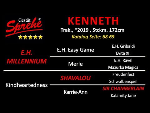 Ein König im Viereck! In wahrlich majestätischer Aufmachung präsentiert sich Kenneth, Prämienhengst beim 59. Trakehner Hengstmarkt 2021 Neumünster, der durch ein Höchstmaß an Charme und Ausstrahlung imponiert. Er begeistert mit drei Grundgangarten der Sonderklasse, ist stets bei der Sache und hat die Etappen des HLP-Sporttests 2023 bzw. 2024 in Verden bzw. Münster-Handorf jeweils mit Bravour durchlaufen. Kenneth war 2024 altersgemäß siegreich in Dressurpferdeprüfungen der Klasse L. Die ersten Nachkommen sind hinsichtlich Bewegungsqualität, Noblesse und Habitus deutlich vom Vater geprägt. Sie wurden vielfach prämiert und erzielten hervorragende Preise auf Auktionen.