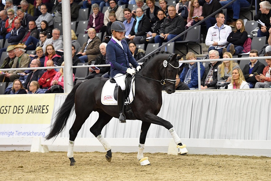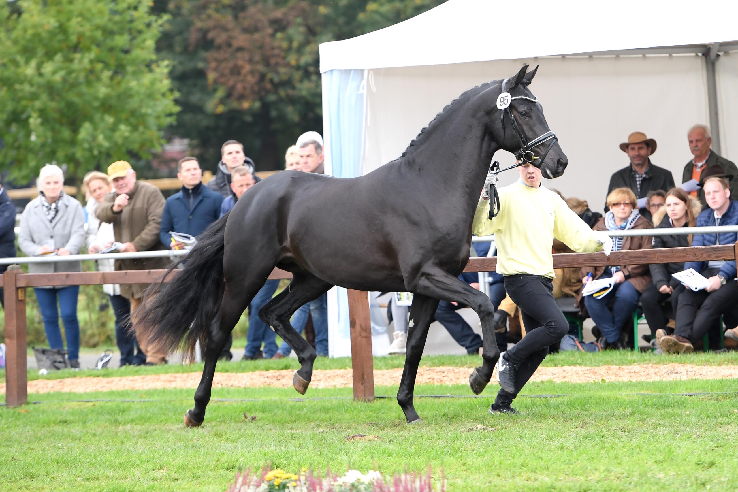 Strahlend aufgemachter Edelrappe, ganz deutlich als Spross seiner berühmten Vorfahren erkennbar. Groß angelegt, mit bedeutenden Partien und viel Harmonie im Körper, verfügt er über ein phänomenales Grundgangartenpotenzial mit einem spektakulär unterfußendem Hinterbein und einem Maximum an Grundschwung, der seinesgleichen sucht. Auch Mykonos‘ reiterliche Entwicklung lässt nur einen Schluss zu: hier reift etwas ganz Besonderes heran. Geradezu vorbildlich sind seine stete Leistungsbereitschaft bei viel innerer Ruhe und sein erstklassiger Charakter. In 2018 absolvierte Mykonos seinen 14-Tage-Test mit durchweg überdurchschnittlicher Benotung, 2019 legte er erfolgreich den Sporttest ab.