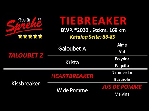Die Mutter Kissbreaker hat keinen Geringeren als Heartbreaker zum Vater, Vierter im Großen Preis von Aachen mit Peter Geerink (NL). Als Springvererber von Weltbedeutung wird ihm vor allem in der Rolle als Muttervater ein besonderer Genius zugesprochen. Die Ahnenfolge findet mit Jus de Pomme, Ulrich Kirchhoffs Doppelolympiasieger von Atlanta (1996), und dem westfälischen Ramiro-Sohn Romeo eine klangvolle Fortsetzung. Tiebreakers Mutter ist Schwester zu fünf international erfolgreichen Springpferden. Ihr gekörter Vollbruder Faldiano hat sich im Spätherbst seiner Karriere 2022 eindrucksvoll entwickelt. Unter Jens Vandenberk (BEL) gewann er Silber im 1,60m-Grand Prix in Lier und Bronze im umkämpften Sires of the World. Mit Goldbreaker ist ein weiterer gekörter Vollbruder bis auf 1,50m-Level platziert (Amanda Derbyshire (GBR)). Die Halbbrüder Elano (von Lux / 1,50m-platziert) und Indigo (von Indoctro / 1,55m-platziert) sind weitere Belege der Vererbungssicherheit dieses Stutenstamms. Zur direkten Verwandtschaft gehören auch drei Championatsteilnehmer. V de Pomme, Vollbruder zu Terminators Großmutter, sprang unter Fernando Martinez Zuviria (ARG) die WEG in Lexington (2010). Acht Jahre zuvor gewann O de Pomme mit Stanny van Paesschen (BEL) Teambronze bei den WEG in Jerez de Frontera, und im WM-Parcours von Tryon (2018) war QH Baloudarc LF unter Marcelo Chirico Ferreira (URY) zu sehen.