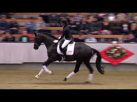 A brilliantly presented noble black stallion, clearly recognizable as son of his popular ancestors! Large-framed with strong limbs harmoniously integrated into the body – he is gifted with phenomenal basic gaits, always engaged hindquarters which cause a maximum of basic impulsion that has no equal. He fascinated with pure elasticity at the presentations in Verden every day of licensing. First impressions on the lungeing-rein and under saddle confirm: here we have something really special. His steady willingness to perform with much inner peace and his first-class character make him absolutely exemplary.